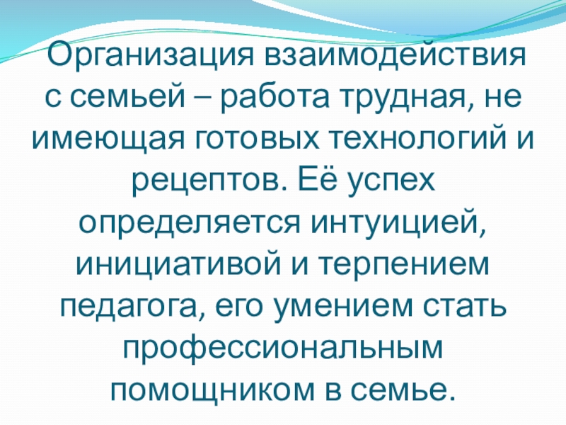 Слайд 7 Организация взаимодействия с семьей – работа трудная, не имеющая готовых