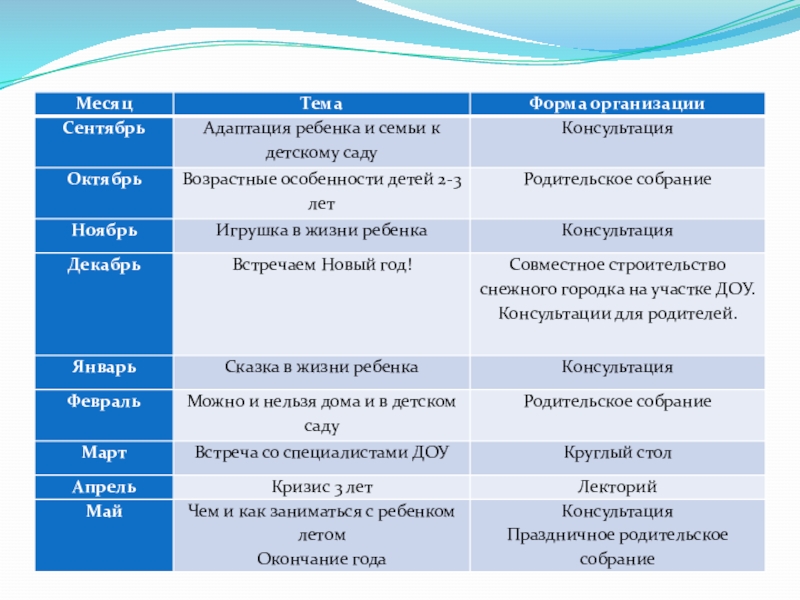 ребенка», «Сказка в жизни ребенка», «Основные проявления кризиса трех лет», «Совместные игры детей с родителями», Как одевать ребенка в детский сад», «Зимние игры на улице», «Иры детей раннего возраста», «Игры с водой», «Музыкальное развитие детей дошкольного возраста», «Пригодится», «Эффект бумеранга», «Воспитание мужественности и женственности», «Патриотическое воспитание», «Закаливание детей в ДОУ и дома», «Польза настольных игр для развития детей», «Советы по безопасности на дороге».