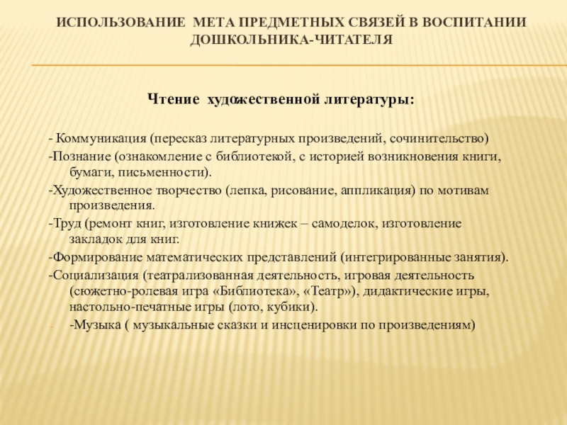 Слайд 8Использование мета предметных связей в воспитании дошкольника-читателя