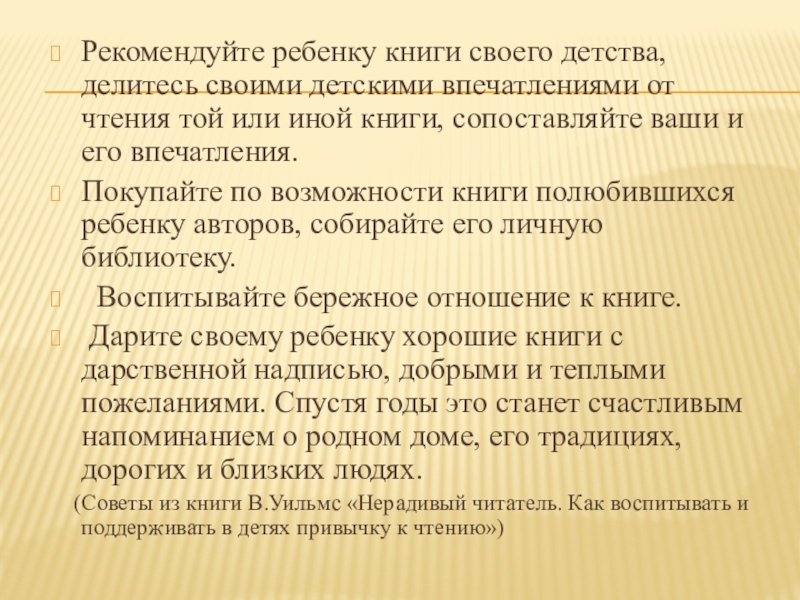 (Советы из книги В.Уильмс «Нерадивый читатель. Как воспитывать и поддерживать в детях привычку к чтению»)