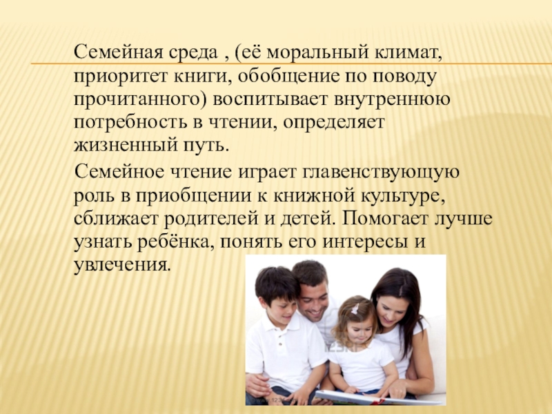 Слайд 15 Семейная среда , (её моральный климат, приоритет книги, обобщение