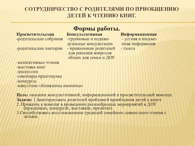 Задачи: 1.Заинтересовать родителей проблемой приобщения детей к книге