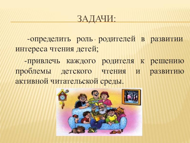 -привлечь каждого родителя к решению проблемы детского чтения и развитию активной читательской среды.