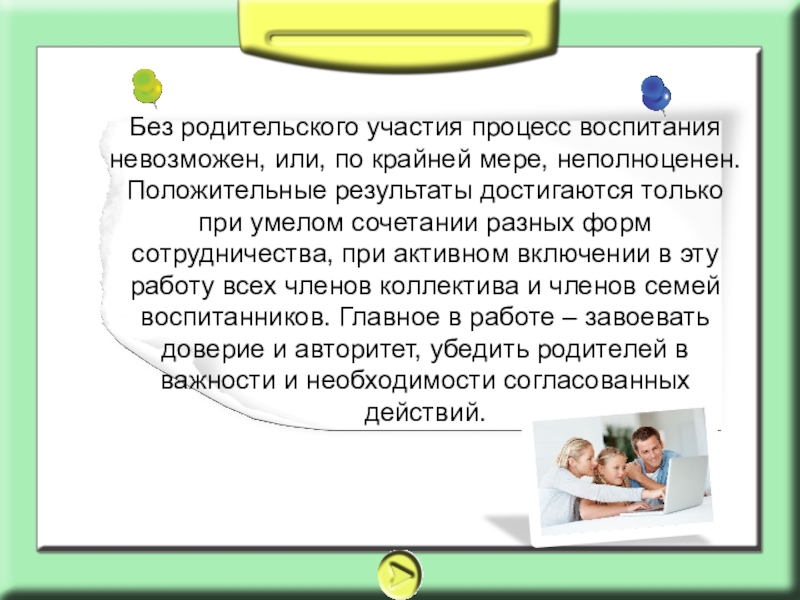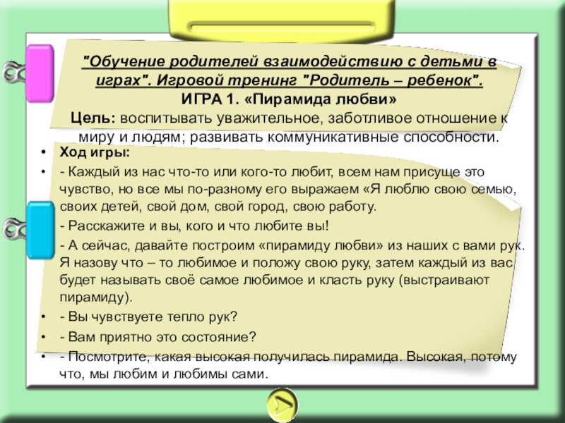 "Обучение родителей взаимодействию с детьми в играх". Игровой тренинг "Родитель – ребенок".