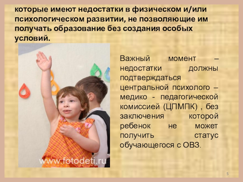 Важный момент – недостатки должны подтверждаться центральной психолого –медико - педагогической комиссией (ЦПМПК) , без заключения которой ребенок не может получить статус обучающегося с ОВЗ.