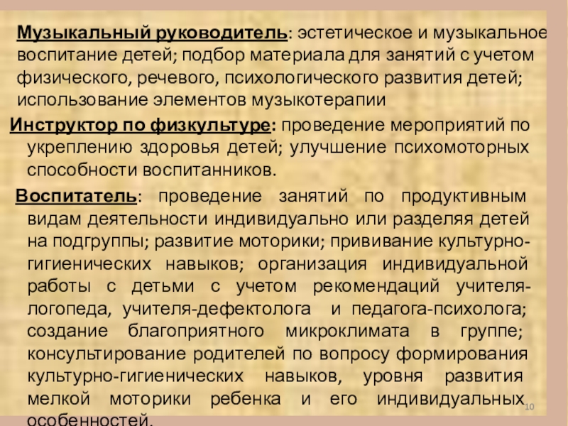 Воспитатель: проведение занятий по продуктивным видам деятельности индивидуально или разделяя детей на подгруппы; развитие моторики; прививание культурно-гигиенических навыков; организация индивидуальной работы с детьми с учетом рекомендаций учителя-логопеда, учителя-дефектолога и педагога-психолога; создание благоприятного микроклимата в группе; консультирование родителей по вопросу формирования культурно-гигиенических навыков, уровня развития мелкой моторики ребенка и его индивидуальных особенностей.
