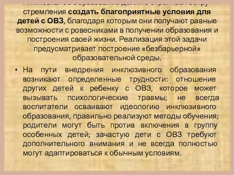 На пути внедрения инклюзивного образования возникают определенные трудности: отношение других детей к ребенку с ОВЗ, которое может вызывать психологические травмы; не всегда воспитатели осваивают идеологию инклюзивного образования, правильно реализуют методы обучения; родители могут быть против включения в группу особенных детей; зачастую дети с ОВЗ требуют дополнительного внимания и не всегда полностью могут адаптироваться к обычным условиям.