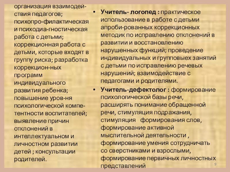 Учитель- логопед : практическое использование в работе с детьми апроби-рованных коррекционных методик по исправлению отклонений в развитии и восстановлению нарушенных функций; проведение индивидуальных и групповыех занятий с детьми по исправлению речевых нарушений; взаимодействие с педагогами и родителями.