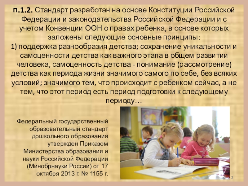 Федеральный государственный образовательный стандарт дошкольного образования утвержден Приказом Министерства образования и науки Российской Федерации (Минобрнауки России) от 17 октября 2013 г. № 1155 г.