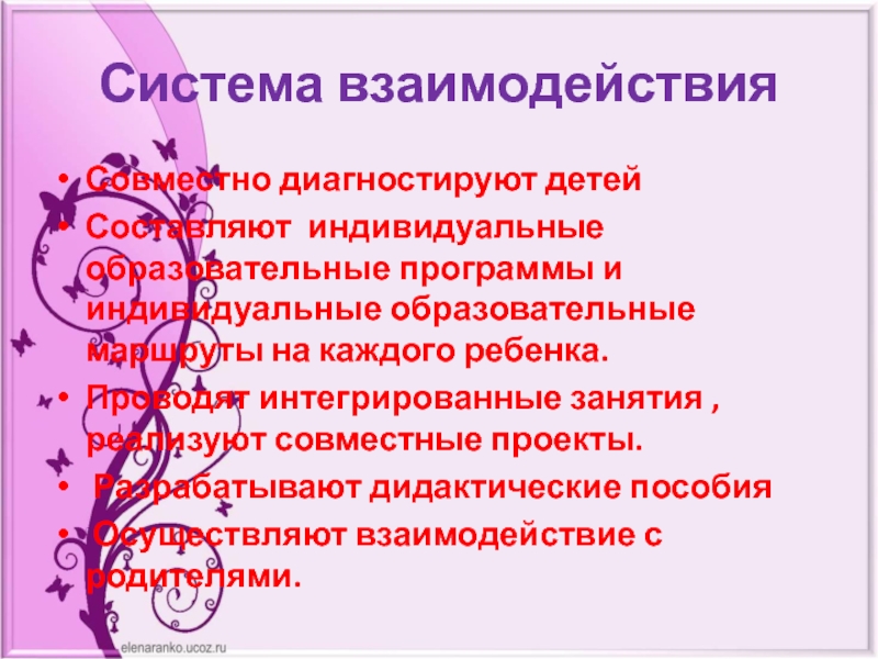 Система взаимодействияСовместно диагностируют детейСоставляют индивидуальные образовательные программы и индивидуальные образовательные маршруты на каждого ребенка.Проводят интегрированные занятия ,