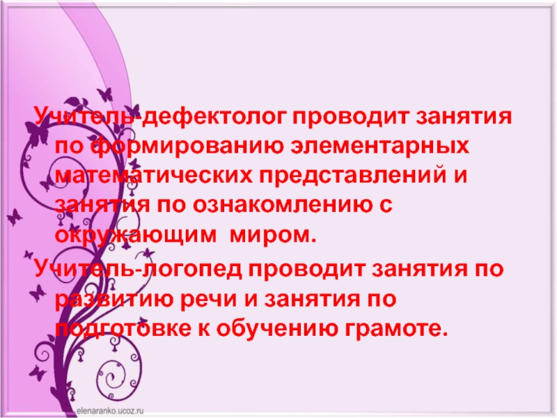 Учитель-дефектолог проводит занятия по формированию элементарных математических представлений и занятия по ознакомлению с окружающим миром.Учитель-логопед проводит занятия