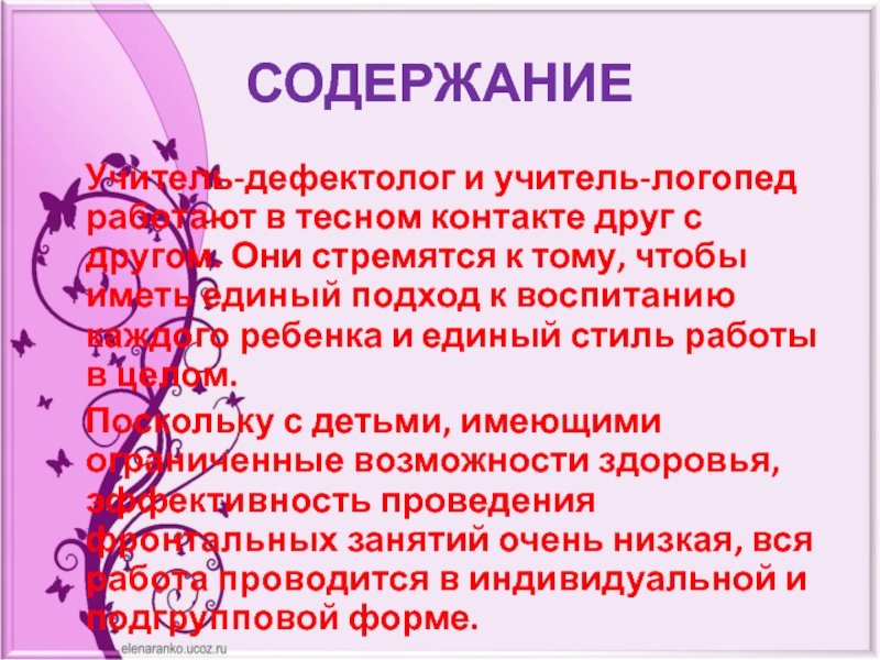 СОДЕРЖАНИЕ  Учитель-дефектолог и учитель-логопед работают в тесном контакте друг с другом. Они стремятся к тому, чтобы