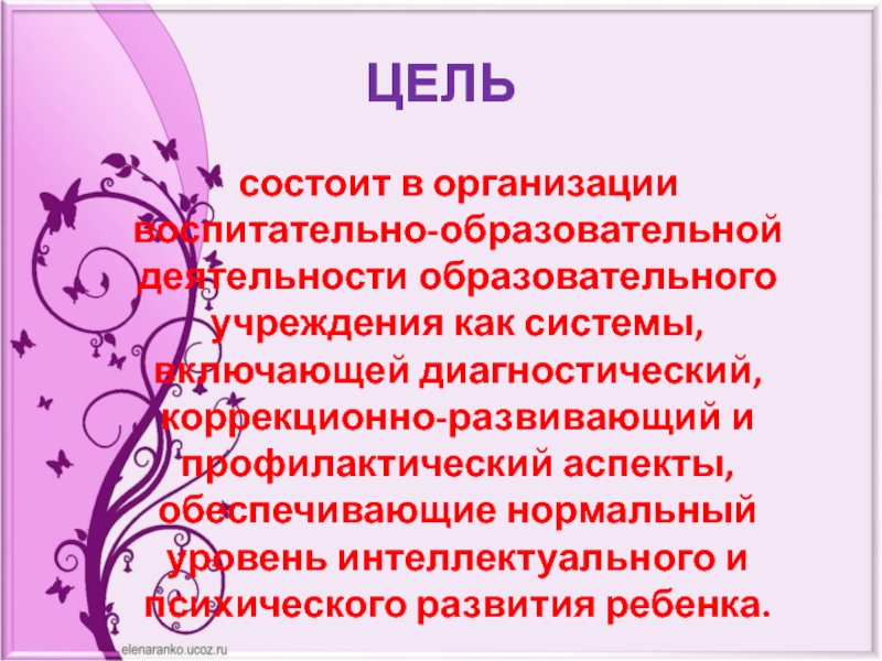 ЦЕЛЬ состоит в организации воспитательно-образовательной деятельности образовательного учреждения как системы, включающей диагностический, коррекционно-развивающий и профилактический аспекты, обеспечивающие нормальный  уровень интеллектуального и психического развития ребенка.