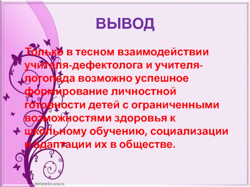 ВЫВОД   Только в тесном взаимодействии учителя-дефектолога и учителя-логопеда возможно успешное формирование личностной готовности детей с ограниченными возможностями