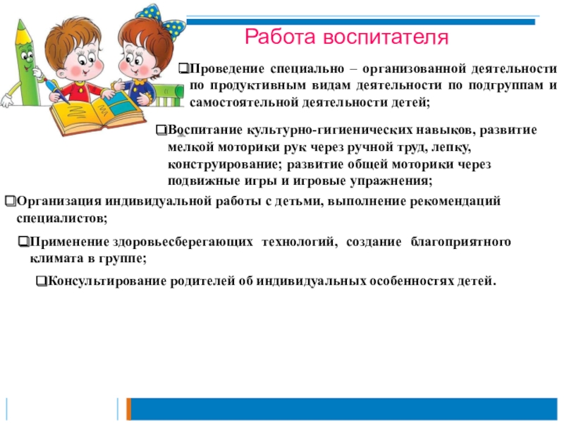 Организация индивидуальной работы с детьми, выполнение рекомендаций специалистов;