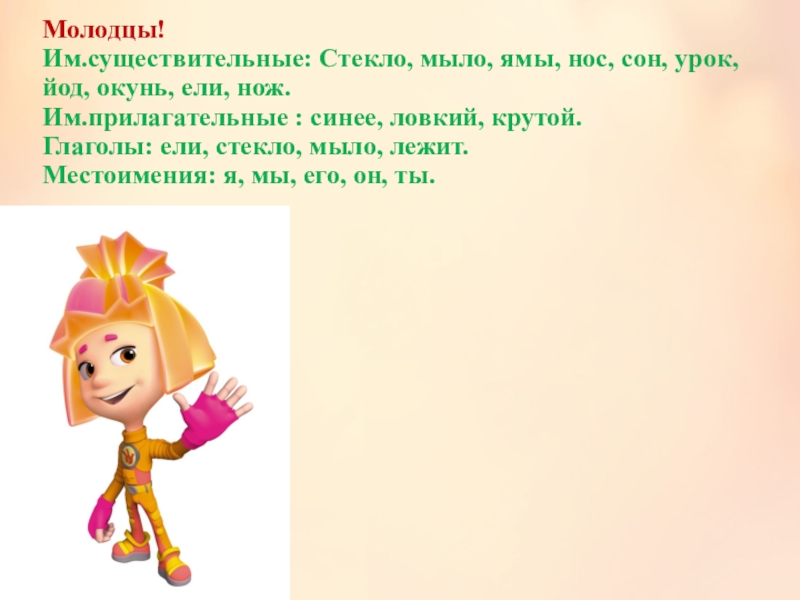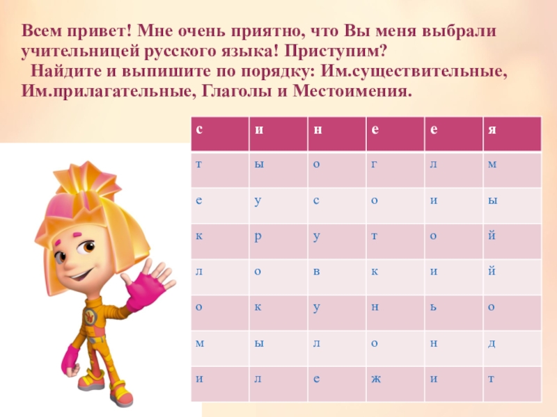 Найдите и выпишите по порядку: Им.существительные, Им.прилагательные, Глаголы и Местоимения.