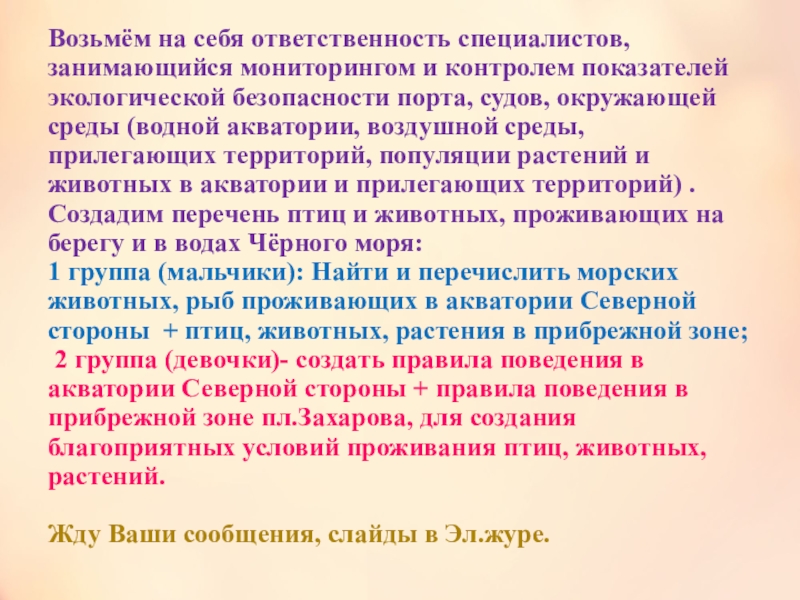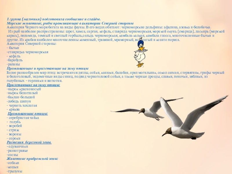 1 группа (мальчики): Найти и перечислить морских животных, рыб проживающих в акватории Северной стороны + птиц, животных, растения в прибрежной зоне;