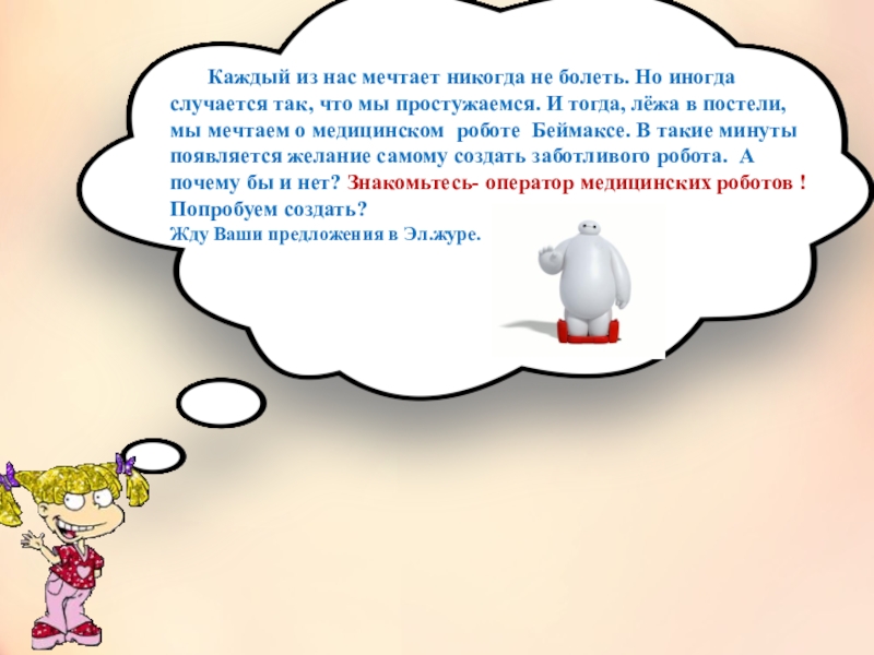 Но иногда случается так, что мы простужаемся. И тогда, лёжа в постели, мы мечтаем о медицинском роботе Беймаксе. В такие минуты появляется желание самому создать заботливого робота. А почему бы и нет? Знакомьтесь- оператор медицинских роботов ! Попробуем создать?