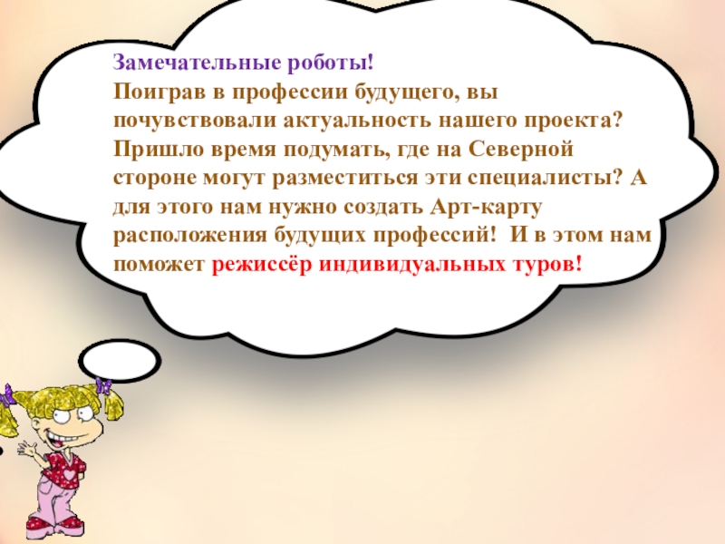актуальность нашего проекта? Пришло время подумать, где на Северной стороне могут разместиться эти специалисты? А для этого нам нужно создать Арт-карту расположения будущих профессий! И в этом нам поможет режиссёр индивидуальных туров!