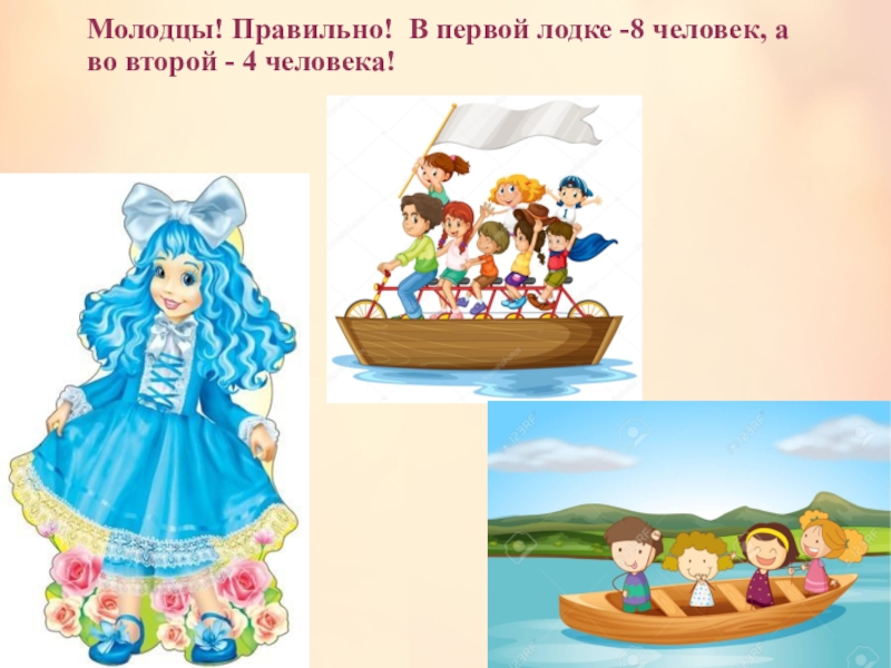 Слайд 31Молодцы! Правильно! В первой лодке -8 человек, а во второй -