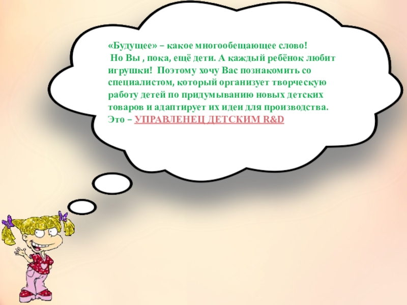 Но Вы , пока, ещё дети. А каждый ребёнок любит игрушки! Поэтому хочу Вас познакомить со специалистом, который организует творческую работу детей по придумыванию новых детских товаров и адаптирует их идеи для производства.
