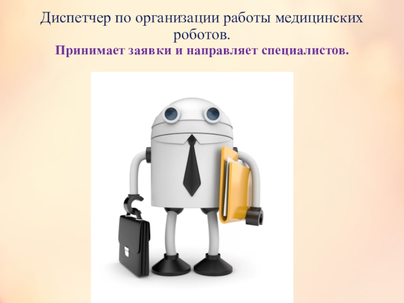 Слайд 36Диспетчер по организации работы медицинских роботов.