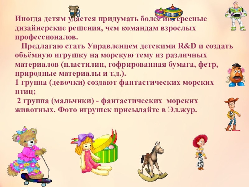 2 группа (мальчики) - фантастических морских животных. Фото игрушек присылайте в Эл.жур.