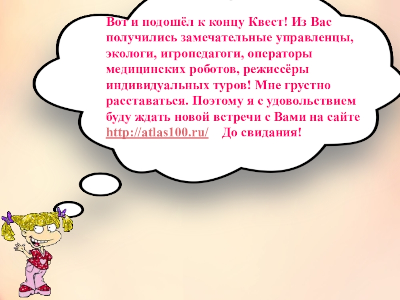 экологи, игропедагоги, операторы медицинских роботов, режиссёры индивидуальных туров! Мне грустно расставаться. Поэтому я с удовольствием буду ждать новой встречи с Вами на сайте http://atlas100.ru/ До свидания!