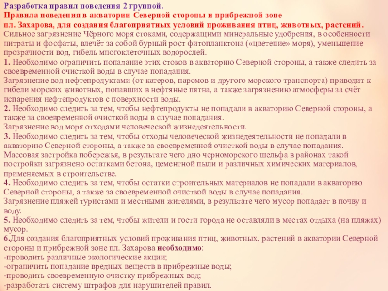 2 группа (девочки)- создать правила поведения в акватории Северной стороны + правила поведения в прибрежной зоне пл.Захарова, для создания благоприятных условий проживания птиц, животных, растений.