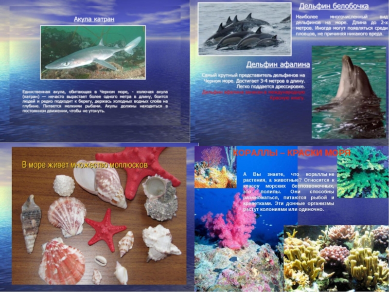 Акватория Черного моря богата на виды фауны. В его водах обитают: черноморские дельфины: афалина, азовка и белобочка.