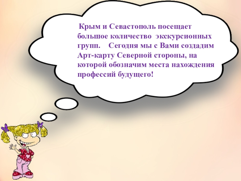 Крым и Севастополь посещает большое количество экскурсионных групп. Сегодня мы с Вами создадим Арт-карту Северной стороны, на которой обозначим места нахождения профессий будущего!