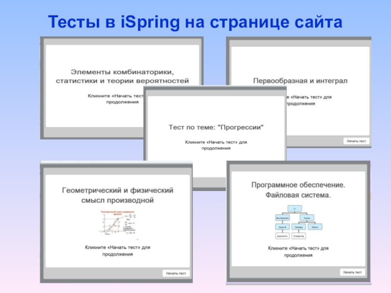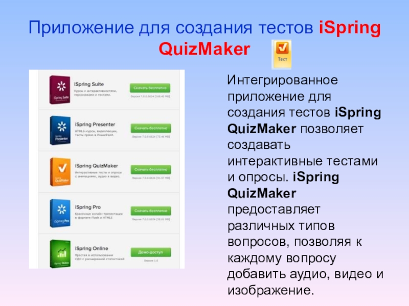 тестов iSpring QuizMaker позволяет создавать интерактивные тестами и опросы. iSpring QuizMaker предоставляет различных типов вопросов, позволяя к каждому вопросу добавить аудио, видео и изображение.