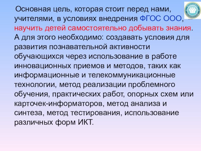 внедрения ФГОС ООО, – научить детей самостоятельно добывать знания. А для этого необходимо: создавать условия для развития познавательной активности обучающихся через использование в работе инновационных приемов и методов, таких как информационные и телекоммуникационные технологии, метод реализации проблемного обучения, практических работ, опорных схем или карточек-информаторов, метод анализа и синтеза, метод тестирования, использование различных форм ИКТ.