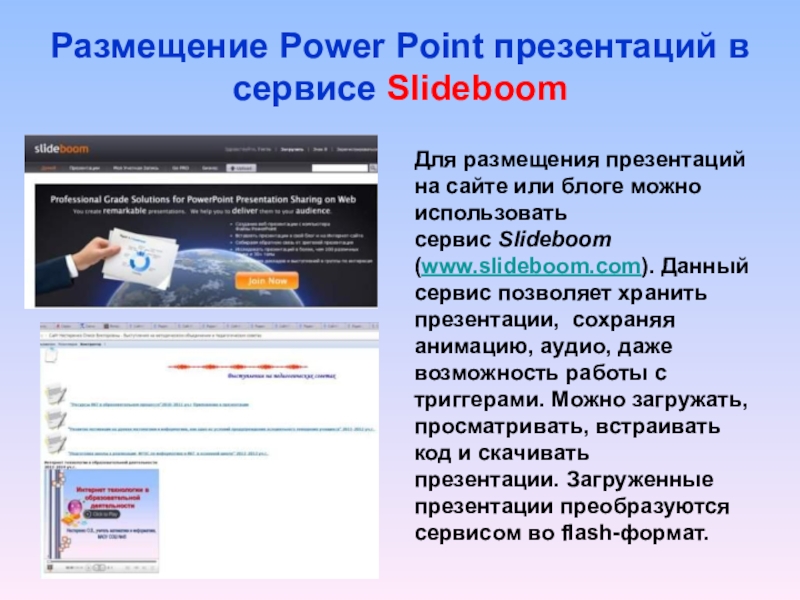 или блоге можно использовать сервис Slideboom (www.slideboom.com). Данный сервис позволяет хранить презентации, сохраняя анимацию, аудио, даже возможность работы с триггерами. Можно загружать, просматривать, встраивать код и скачивать презентации. Загруженные презентации преобразуются сервисом во flash-формат.