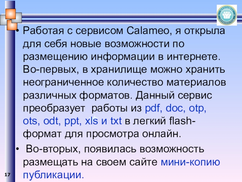размещению информации в интернете. Во-первых, в хранилище можно хранить неограниченное количество материалов различных форматов. Данный сервис преобразует работы из pdf, doc, otp, ots, odt, ppt, xls и txt в легкий flash-формат для просмотра онлайн.