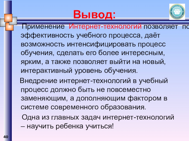 Внедрение интернет-технологий в учебный процесс должно быть не повсеместно заменяющим, а дополняющим фактором в системе современного образования.