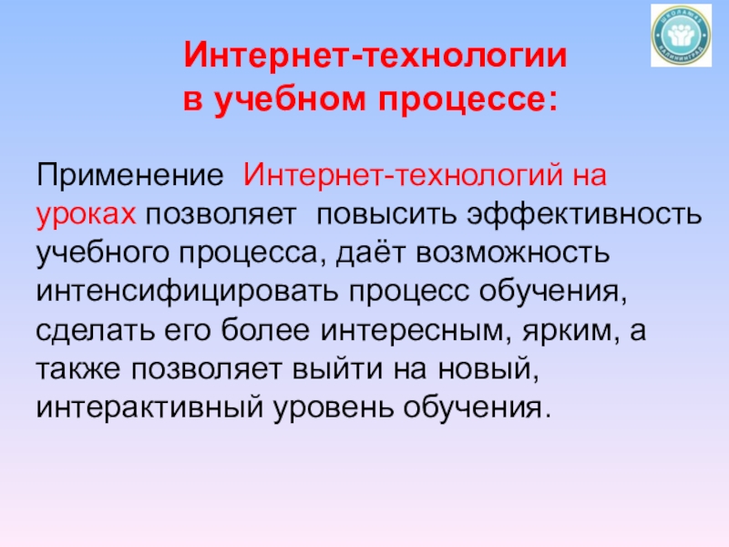 Применение Интернет-технологий позволяет повысить эффективность учебного процесса, даёт возможность