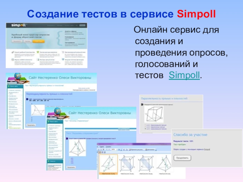 тестирование. Для этого используют готовые тесты, которые предлагает система или вы разрабатываете свои. Но можно воспользоваться сервисом создания тестов test.fromgomel.com. Данный сервис позволяет создавать тесты, которые затем можно вставить на страницу своего сайта. Он позволяет создавать тест из любого количества вопросов, для каждого вопроса можно ввести произвольное количество ответов, среди которых тестируемый должен выбрать верный результат.