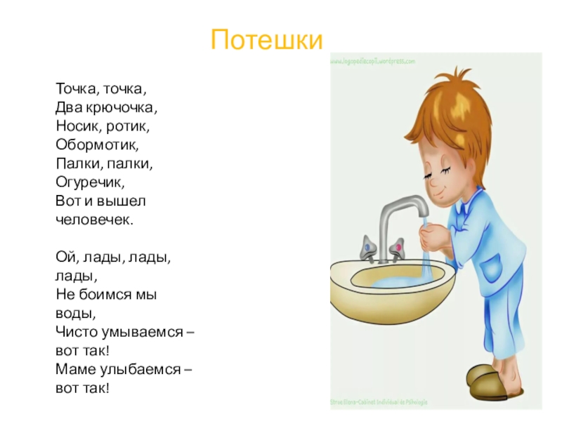 Потешки Точка, точка,Два крючочка,Носик, ротик,Обормотик,Палки, палки,Огуречик,Вот и вышел человечек. Ой, лады, лады, лады,Не боимся мы воды,Чисто умываемся