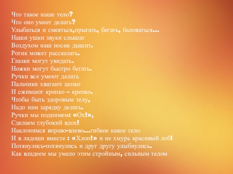 Что такое наше тело?Что оно умеет делать?Улыбаться и смеяться,прыгать, бегать, баловаться…Наши ушки звуки слышатВоздухом наш носик дышит.Ротик может рассказать.Глазки могут увидать.Ножки могут быстро бегать.Ручки все умеют делатьПальчики хватают цепкоИ сжимают крепко – крепко.Чтобы быть здоровым телу,Надо