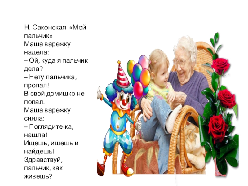 Н. Саконская «Мой пальчик» Маша варежку надела:– Ой, куда я пальчик дела?– Нету пальчика, пропал!В свой домишко