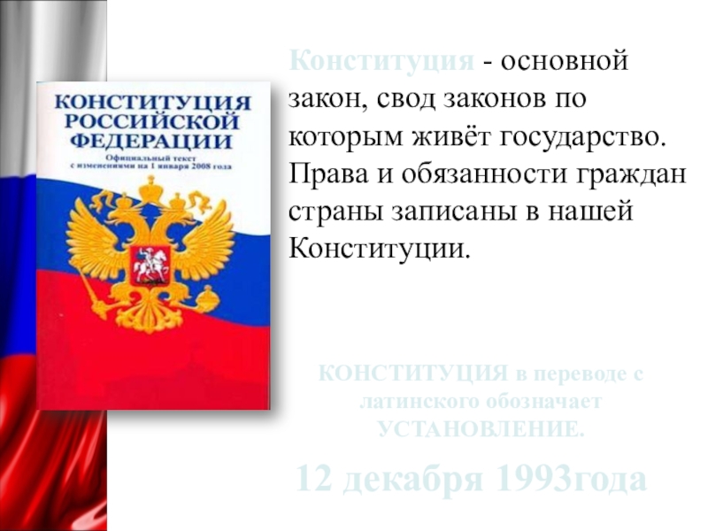 КОНСТИТУЦИЯ в переводе с латинского обозначает УСТАНОВЛЕНИЕ.
