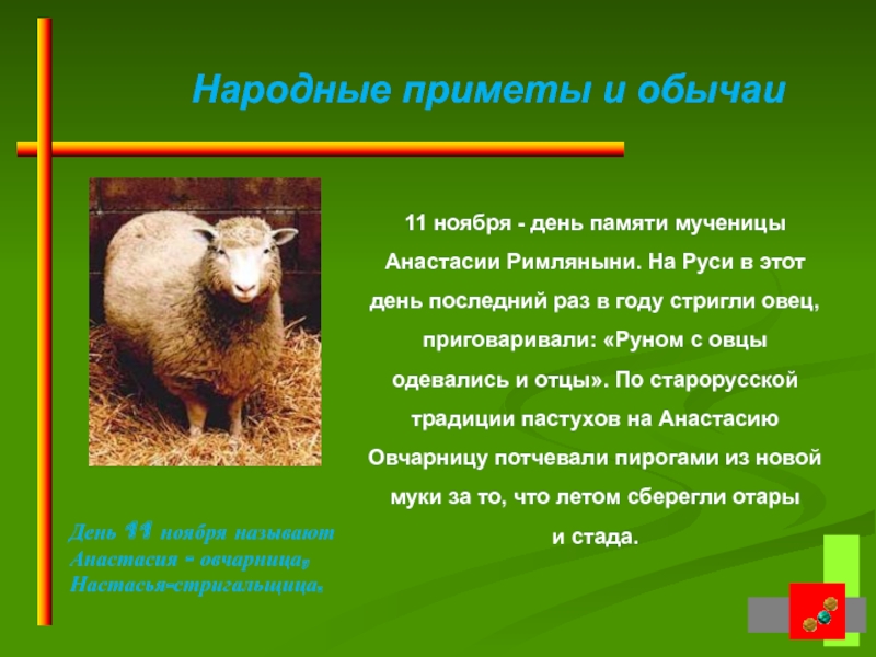 День 11 ноября называют Анастасия - овчарница, Настасья-стригальщица.