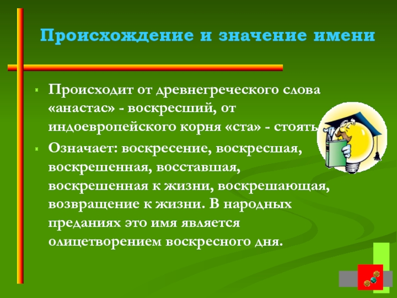 Происходит от древнегреческого слова «анастас» - воскресший, от