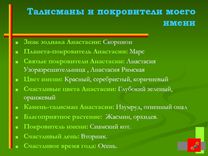 Счастливые цвета Анастасии: Глубокий зеленый, оранжевый