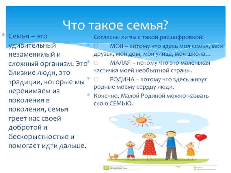Семья – это удивительный незаменимый и сложный организм. Это близкие люди, это традиции, которые мы перенимаем из поколения в поколения, семья греет нас своей добротой и бескорыстностью и помогает идти дальше.