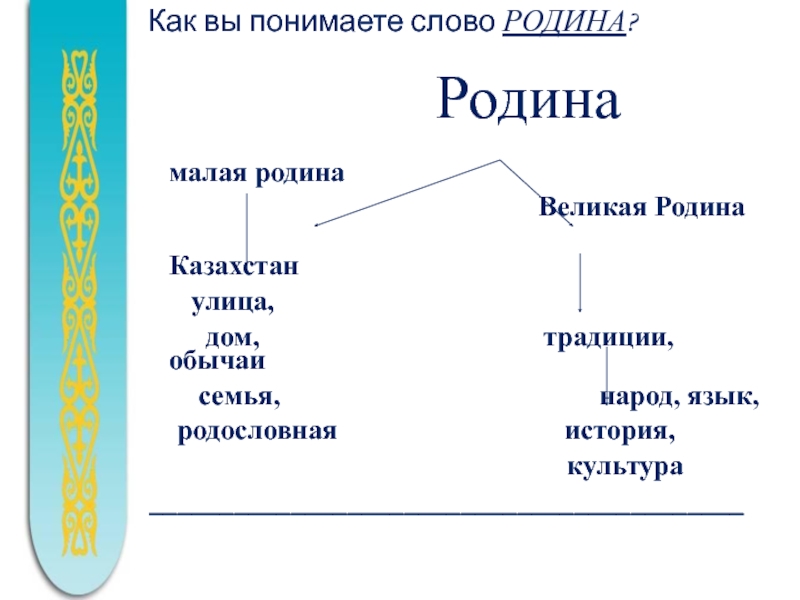 любовь к своей Родине, народу, его истории, языку, национальной культуре; преданность Родине, гордость за неё, стремление служить её интересам, защищать от врагов.