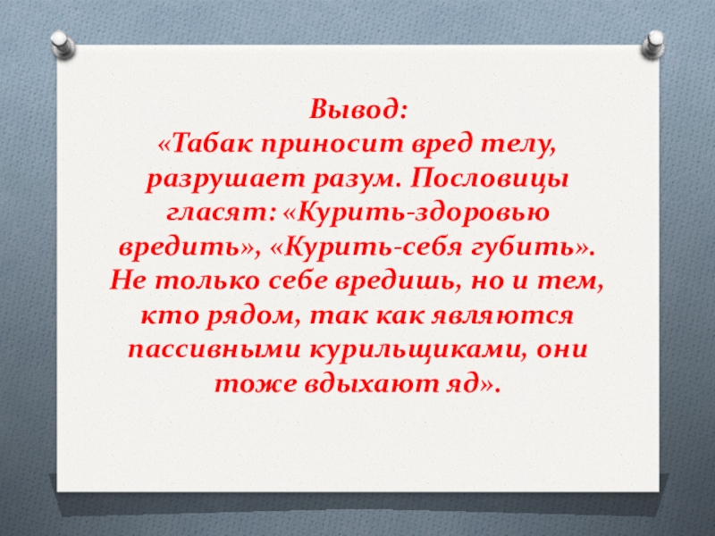 Вывод: «Табак приносит вред телу,разрушает разум. Пословицы гласят: «Курить-здоровью вредить», «Курить-себя губить». Не только себе вредишь, но
