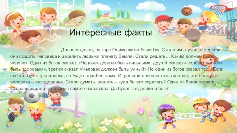 Давным-давно, на горе Олимп жили-были бог. Стало им скучно, и решили они создать человека и заселить людьми планету Земля. Стали решать… Каким должен быть человек. Один из богов сказал: «Человек должен быть сильным», другой сказал «Человек должен быть здоровым», третий сказал «Человек должен быть умный».Но один из богов сказал так: «Если всё это будет у человека, он будет подобен нам». И, решили они спрятать главное, что есть у человека – его здоровье. Стали думать, решать – куда бы его спрятать? Один из богов сказал: «Здоровье надо спрятать в самого человека». Да будет так, решили боги!