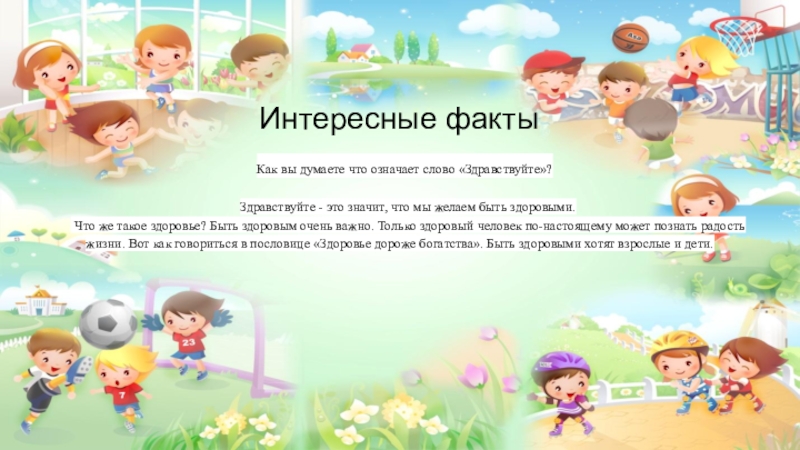 Что же такое здоровье? Быть здоровым очень важно. Только здоровый человек по-настоящему может познать радость жизни. Вот как говориться в пословице «Здоровье дороже богатства». Быть здоровыми хотят взрослые и дети.